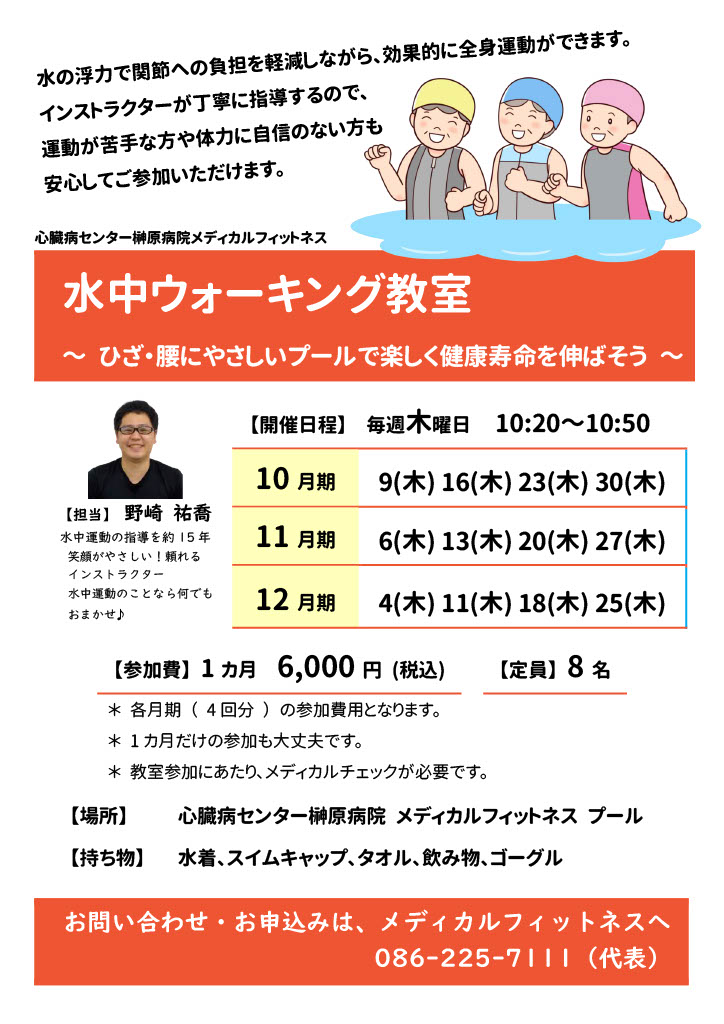 水の浮力で「ひざ」「こし」への負担を和らげながら、全身を動かす水中ウォーキングの教室を行います。